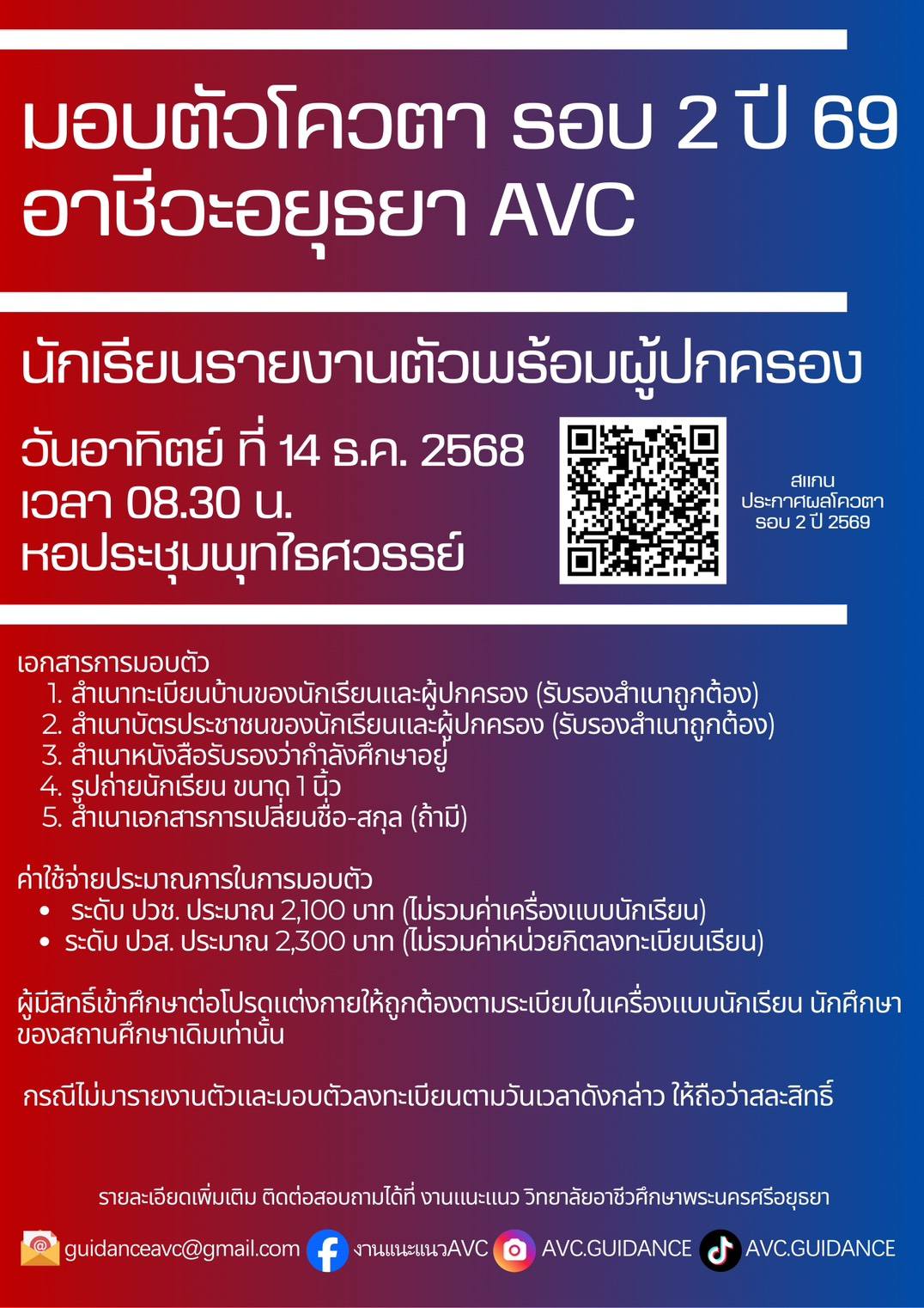 เรื่อง ประกาศรายชื่อนักเรียน นักศึกษาผู้มีสิทธิ์เข้าศึกษาต่อ ระดับประกาศนียบัตรวิชาชีพ (ปวช.) และระดับประกาศนียบัตรวิชาชีพชั้นสูง (ปวส.) ประจำปีการศึกษา ๒๕๖๙ ประเภทโควตา (รอบที่ ๒)